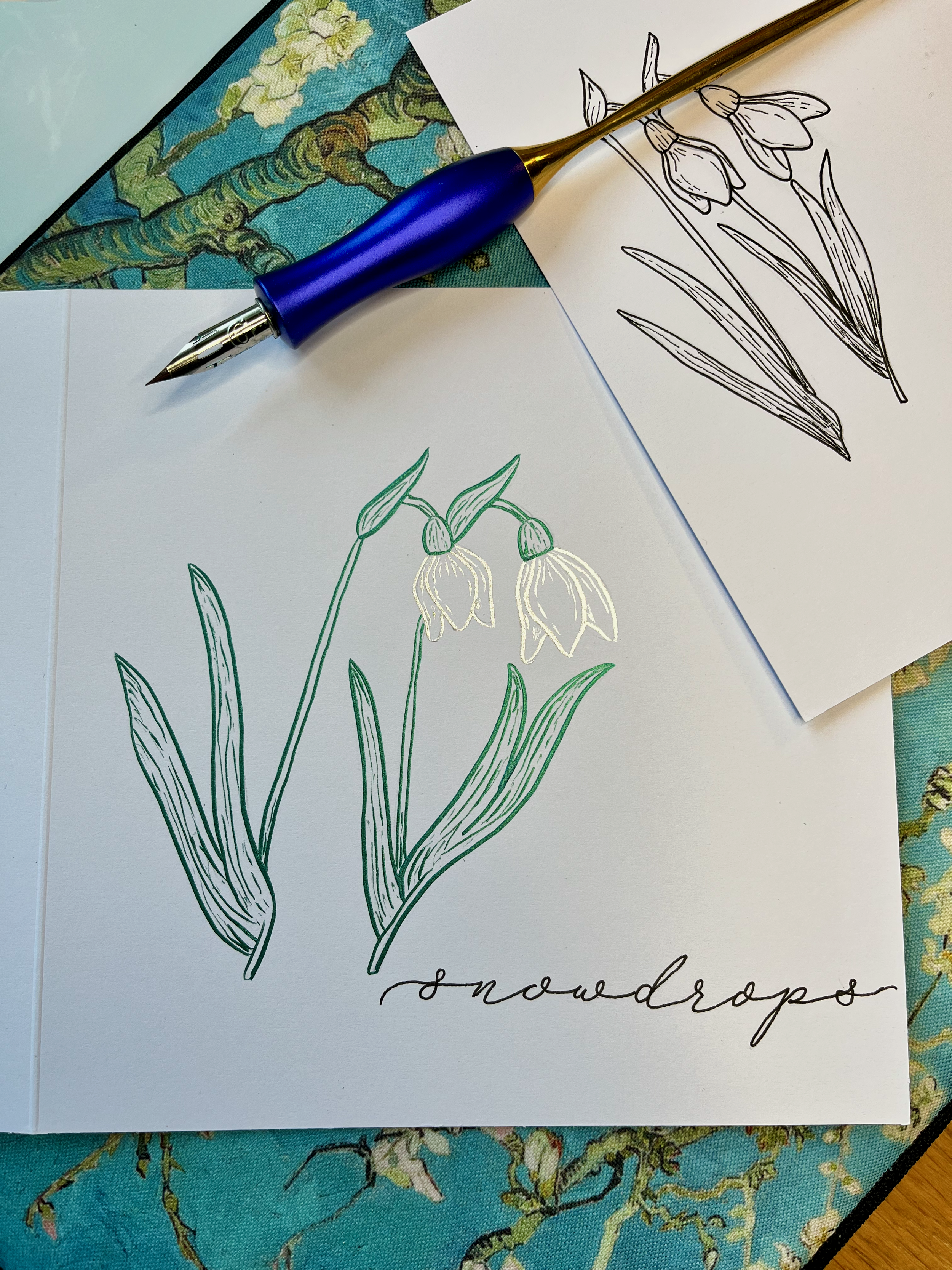 After I got home, I was feeling inspired and I decided to draw the snowdrops with my pointed pen and add some monoline calligraphy. (Many people aren’t aware that pointed pens are excellent for illustration too!)